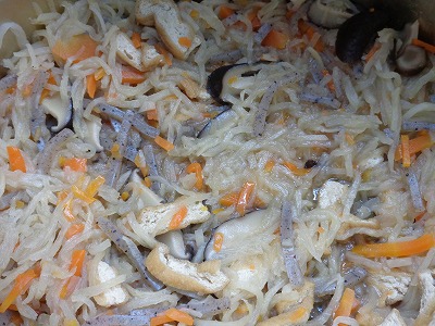切り干し大根は、朝一番に煮て戻しています。戻し汁も使って調味します。