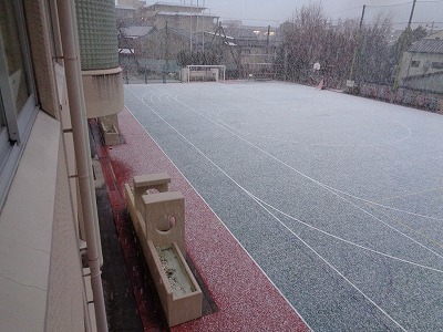 子ども達が下校して、1時間半がたったでしょうか。午後5時の運動場です。うっすら雪化粧をしています。明日の朝は真っ白かもしれませんね。