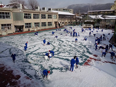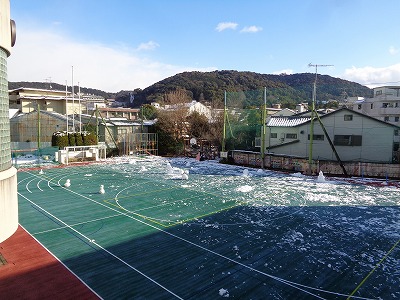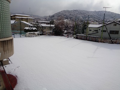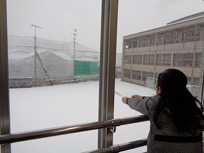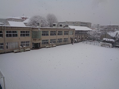 今朝の運動場は、一面が雪で覆われていました。