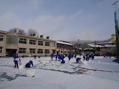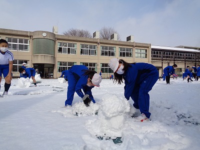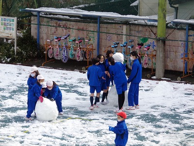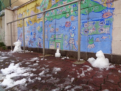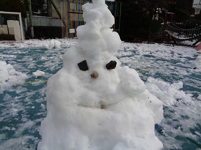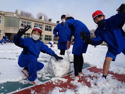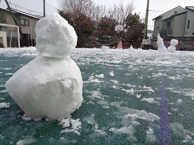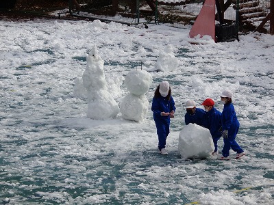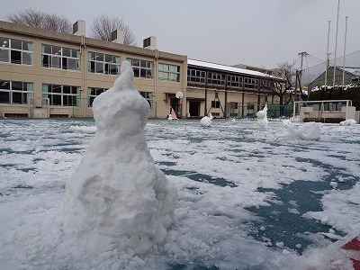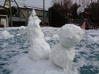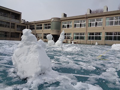 みんなと共に力を合わせた作品です。6年生は1m50cmくらいの雪だるまを作っていました。