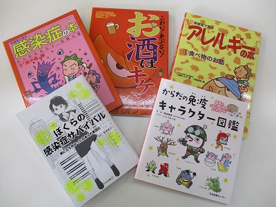 保健室には、健康に関する色々な本が置いてあります。体のこと、免疫のこと、アレルギー、感染症、お酒やたばこのことなどなど。