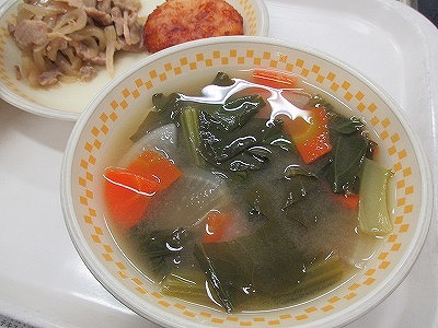 ☆ 小松菜、人参、大根の味噌汁です。小松菜、人参の鮮やかな色がきれいな味噌汁になりました。小松菜は骨を丈夫にするカルシウムや、貧血の予防になる鉄が豊富な野菜です。