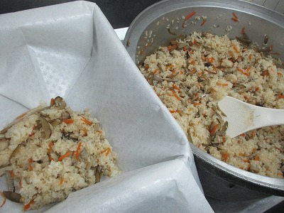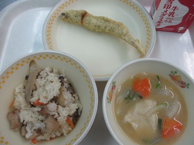 ☆ 九州では鶏肉のことを「かしわ」とよびます。「かしわめし」は鶏肉や野菜、きのこなどの具材を煮たものをご飯に混ぜ合わせた料理です。今日の給食は、鶏肉、ごぼう、人参、しめじを使いました。家庭料理として日常で食べられたり、祭りやお祝い事の日にも食べられるそうです。