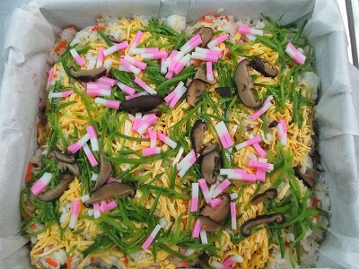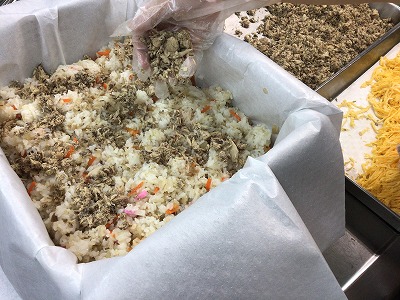 ☆ 丹後のまつぶたずしは、さばのそぼろやかんぴょう、錦糸卵、かまぼこなど具だくさんで、色鮮やかなおすしです。さばのそぼろは、ご飯の間に重ねて入れました。