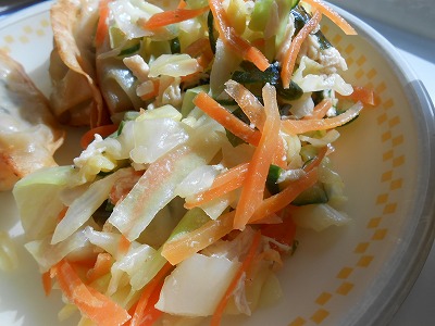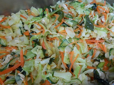 ☆ わかめサラダは、わかめ、人参、キャベツ、きゅうり、鶏ささみ肉を合わせました。