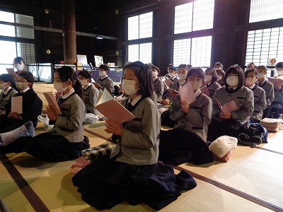 厳かな空気の中、子ども達は背筋を伸ばしています。コロナ禍のために声を出して歌えませんが、法然様の御前に、心の中で歌いました。みんなの気持ちが一つになった時間です。