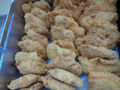 衣が厚くなりすぎないように、小麦粉と卵を合わせたバッター液をよくきりながら、パン粉つけをしています。