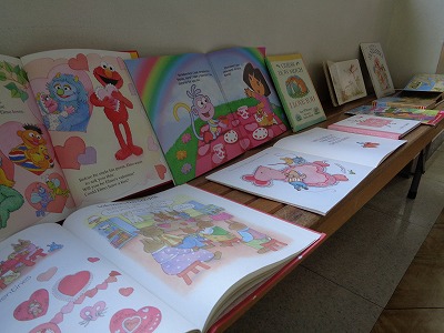 In the hallway, there are many Valentine’s books on display that the students can look at and practice their English reading skills.