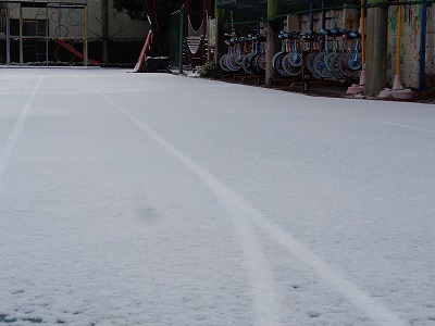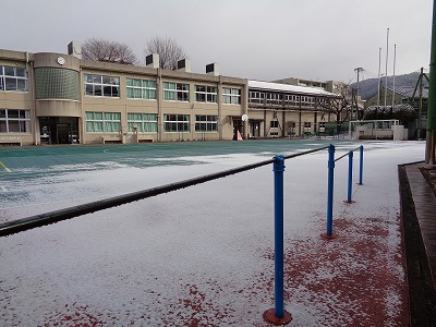 寒い朝を迎えました。少し雪が積もった運動場です。