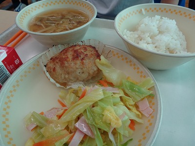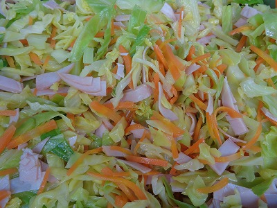 ☆ キャベツ、人参、ハムのサラダは、ゆず風味のドレッシングで味つけをしています。スーパーでは、だんだんと春キャベツや新たまねぎが並ぶようになっています。今日の給食では、葉がぎっしりしまった冬キャベツが野菜屋さんから届けられていました。