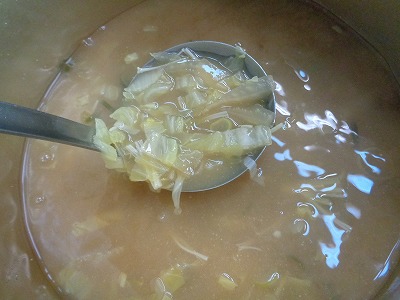 白菜は細めの短冊に切り、細いえのきの形と合わせて、食べやすいようにしています。ねぎの緑色がきれいなお味噌汁が出来上がりました。