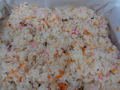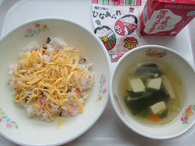 To celebrate the festival, today’s lunch is ”chirashizushi” a special dish made with carrots, shitake, eggs, and small fish called shirasu.