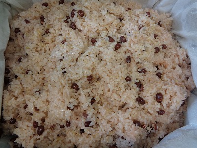 もち米に「小豆」や小豆に似た豆の一種「ささげ」を混ぜて、蒸して調理すると、赤くきれいに色づいてお赤飯が出来上がります。