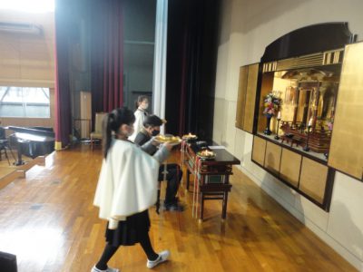 「礼拝係」が2年ぶりに再開し、「いまささぐ」の聖歌とともに御仏様に「お光・お香・お花」をお供えしました。