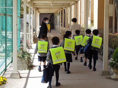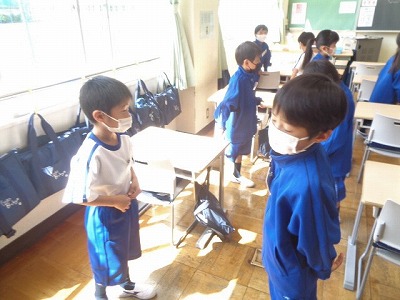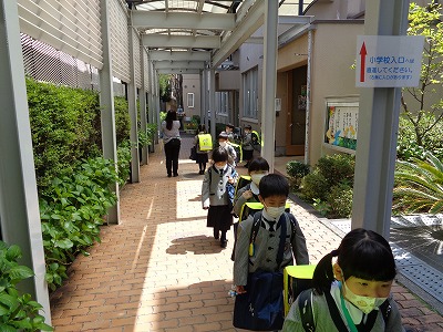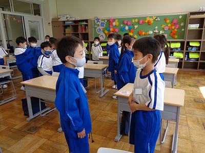 朝は、①手洗い・消毒、②着替え、③ランドセル・文教バッグの片付けと、済ませることがたくさんあります。1年生のみんなは、一つずつ落ち着いて進めていました。着替えるときに困らないように、ネクタイは制服上着のポケットにしまうことも確認しました。