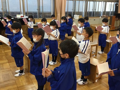 「いま~ささぐ~」という歌の始まりをうまく合わせて歌っていました。歌い終わりには、声を伸ばしながらも、ゆっくりと礼をします。
