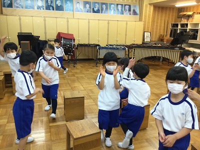 音楽が急に止まったり、弱いところからいきなり強くなったりするなど、とってもにぎやかで明るい音楽です。その流れに体の動きを合わせています。