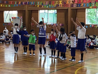 班長さんを中心にやさしく教えてもらって、パフォーマンスでは早速班の一員として声を出したり、身振りをそろえていました。