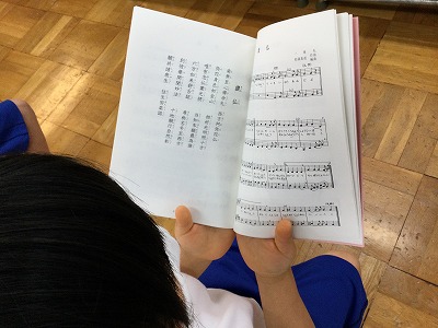 聖歌の練習が終わりに近づいています。「讃仏」という歌は、お花を散らすように(散花)、花びらをあしらった和紙を仏様の前に届ける時に歌唱します。