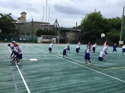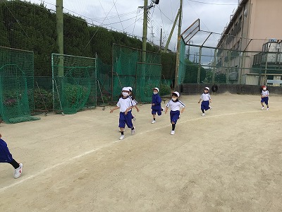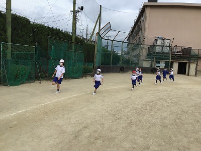 中・高の運動場に行くと、すでに6年生が走っていました。全員で1周走って、2周目は6年生と一緒に、自分の走れるペースで走りました。