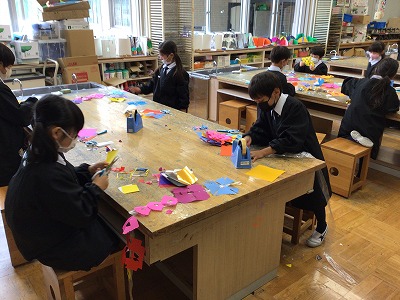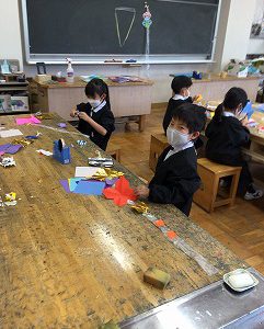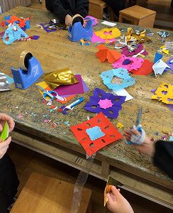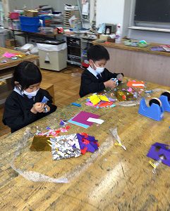 切り方次第でいろいろな形ができるのを楽しみました。重ねばりをしたり、大きさをかえたりして、最後は一つの作品に仕上げていました。