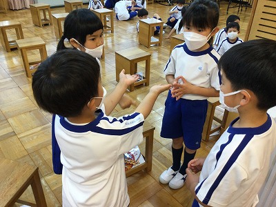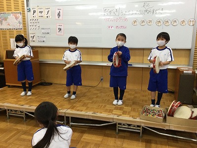 リズム楽器を使ったりして、“拍にのって”を感じる活動を進めました。