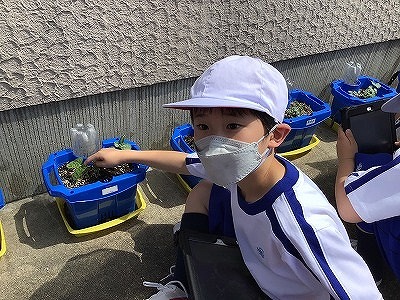 生活科の学習の最初は、アサガオの観察に行きました。双葉が出そろい、少し本葉も見えます。