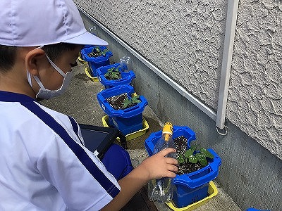 毎朝、子どもたちは登校後、Myボトルを使って、アサガオに声をかけながら水やりをしています。
