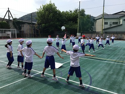 ビオトープや遊具で遊んでいた人も、時間になると集合です。日直さんのかけ声で体操を始めることができました。