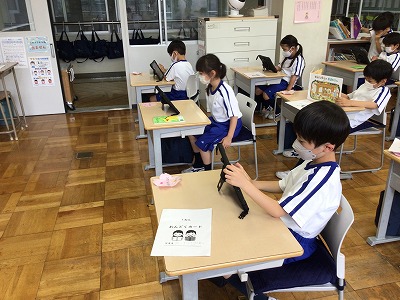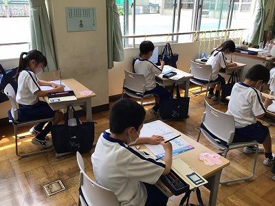 国語は「うつしまる」を使って、ひらがなをきれいに書く練習をしました。今日は、な行とは行です。
