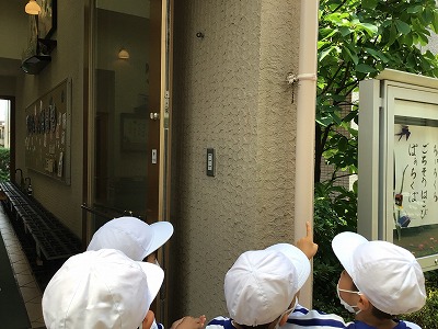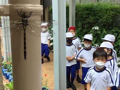 「さぁ、出発!」と言うやいなや、玄関前でみんなが喜ぶ「学びのアイテム」発見!大型のヤゴのぬけがらです。