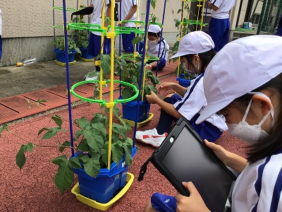 今回は、アサガオの観察です。本葉がたくさん生えてきました。また、つるがどんどん伸びてきて、鉢から出ようとしているものもあります。