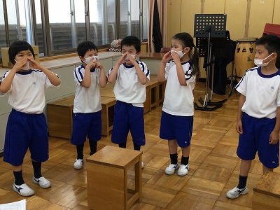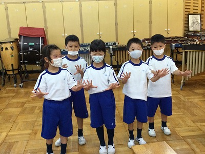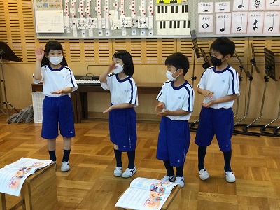 「♪わくわくキッチン」の歌に登場する、「こねこねぽん」や「じゅうじゅうじゅう」などのオノマトペ(擬音・擬態語)に身ぶりを付けて歌おう!と、学習を進めました。