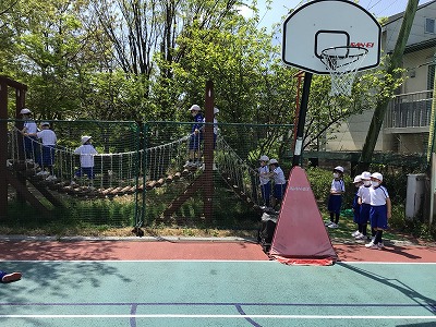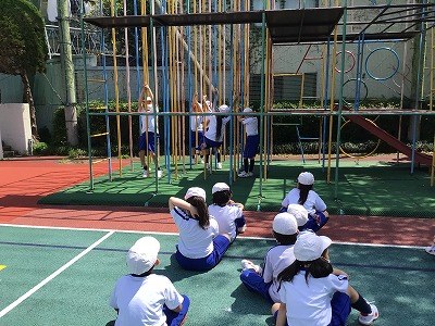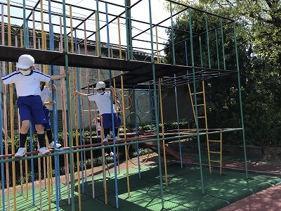 体育の時間です。のぼり棒や遊具を使って上半身の筋力を鍛えたり、バランス感覚を養ったりしています。今のところ、のぼり棒は苦手な人が多いようですが、みんなよくがんばっています。