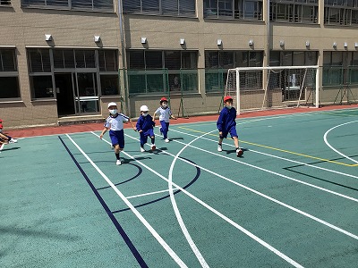 次は、かけっこです。うまく走れるように、早歩きや大股走り、スキップなどのいろいろな走り方を体験しました。