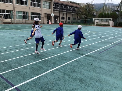 速く走るための練習をしています。これは、スキップ走法の練習です。