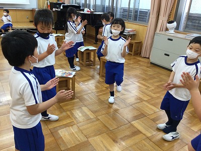 「♪朝のリズム」の軽快な歌に合わせて、“ひざ打ち”“床打ち”“手打ち”のリズムを取り入れます。