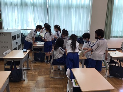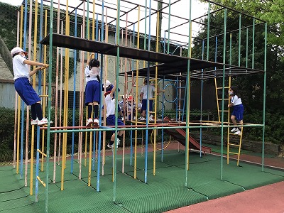 一旦水分補給をした後、体育を始めました。準備体操の後、のぼり棒チャレンジ、続いて総合遊具チームと一輪車チームに分かれて、それぞれの運動を楽しみました。