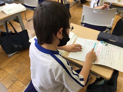 日々ライティングしてきた英単語の振り返りや、文字音の確認をしました。これまで学習してきた"It's a fine day." "Let's have fun!"などの英語フレーズにも触れました。