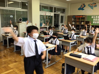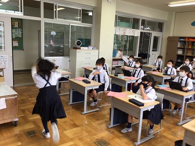 今回のメイン学習は、ある動作が何をしているのかを当てて、英語で発表するものです。20の動詞を繰り返し、音声や動作を通して覚えようと取り組んだ後、先生の動作を当てるクイズで大笑い。一生懸命英語で答えられました。