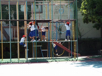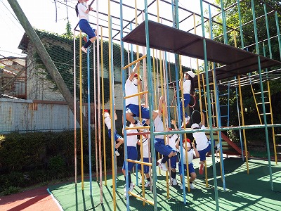 体育の時間。のぼり棒や総合遊具の探検をしています。
