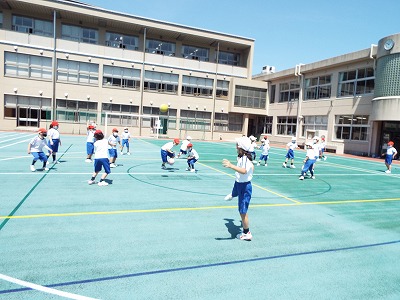 体育の最後はドッジボールです。みんなの動きがドッジボールらしくなってきました。