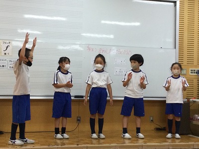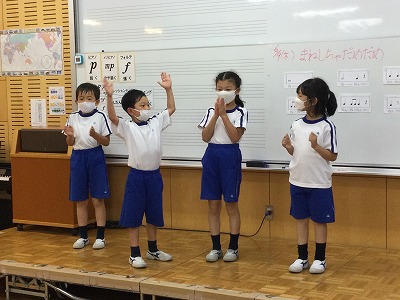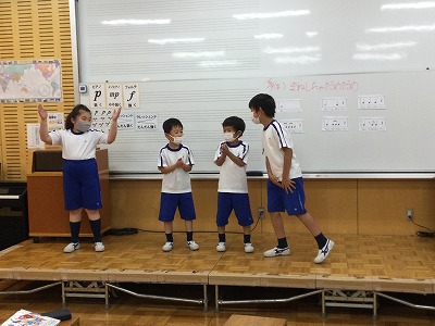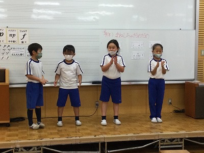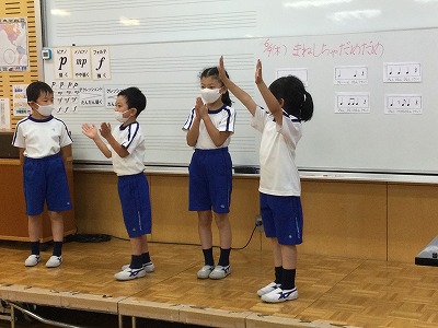 次の時間は、“体を使ってリズム打ち”に取り組みます。「リズムをまねして・・・」のように、グループで自分のも、友達のも打ち合う計画です。