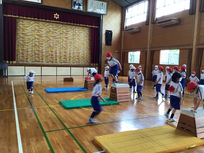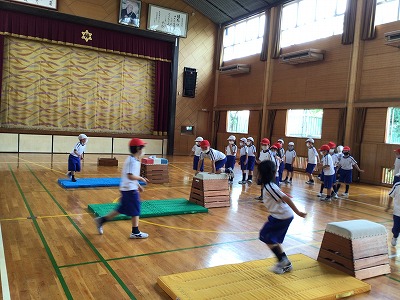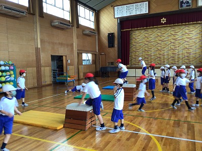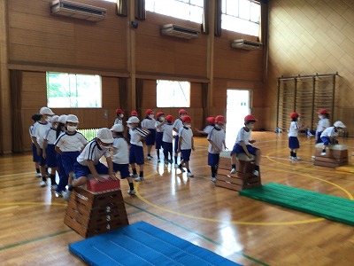 跳び箱の大きさや高さになれるために、上から跳んだり、またいだりしているところです。
