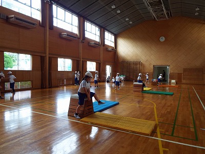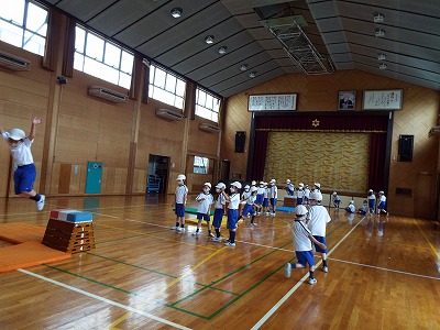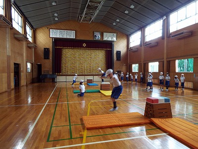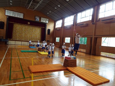 今日は、跳び箱の縦と横の両方を使って、上から「大の字ポーズ」で跳んだり、跳び箱の跳び方を確認したりしました。