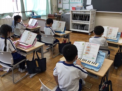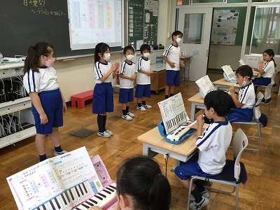 本時では、ビルの和音が響くだけではなく、その音をリズムに合わせて吹くことにもチャレンジしました。各チームの友達に前に出てきてもらい、一人が打つリズムを聞いて、みんなはリズムを音に出して返す方法です。