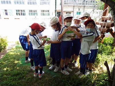つかまえたトンボやメダカ、ダンゴムシは、虫かごに入れて観察しました。