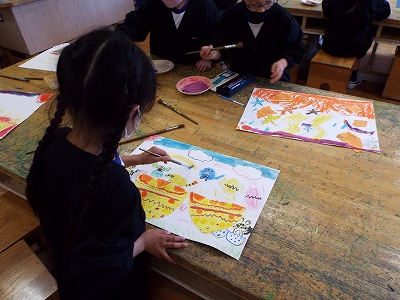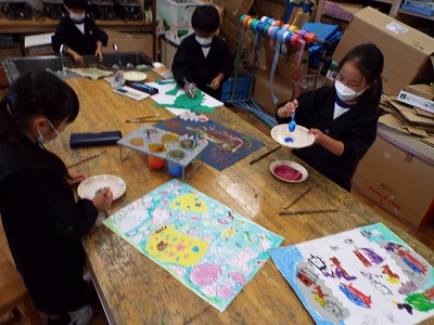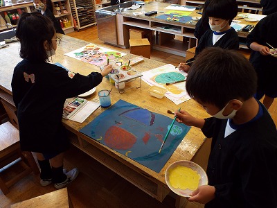 絵の具は、同じ色でもクレヨンと違った発色をするので、さらに作品が華やかになりました。