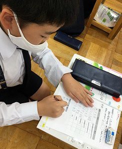 用意したプリントに、それぞれの音符の名前と長さを確かめながら、記入していきました。