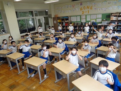 まずは、3年生の教室から、運動場へどのように避難するかを指導しました。